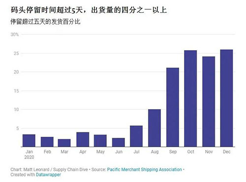 洛杉磯、長灘港口情況嚴峻,新的一年并沒有太大的改觀。依然是擁堵嚴重,新冠感染人數的上升和陸地運輸的延遲,讓港口貨物堆積越來越多,增加了集裝箱船卸貨的進度。很多國內過來的集裝箱船都無法靠港卸貨,相關人士預計普船靠港卸貨時間預計需要一到兩周的時間。