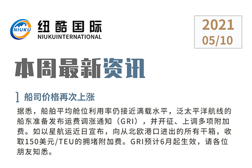 據悉,船舶平均艙位利用率仍接近滿載水平,泛太平洋航線的船東準備發布運費調漲通知(GRI),并開征、上調多項附加費。如以星航運近日宣布,向從北歐港口進出的所有干箱,收取150美元/TEU的擁堵附加費。GRI預計6月起生效,請各位朋友知悉。