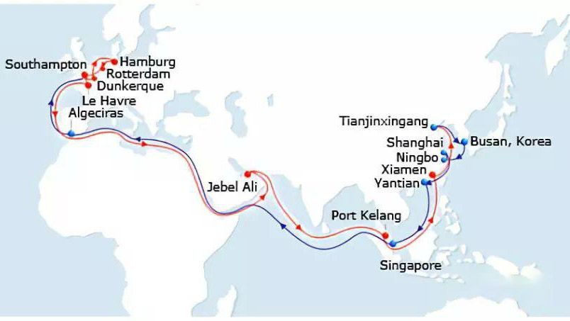 由于中國到英國的航程較長,中小型集裝箱船的運輸成本較高,通常采用大型集裝箱船,裝載量約在20000-25000的TEU之間。由于裝載量大,船只在國內只掛靠兩個港口可能難以保證滿載出航,所以會多掛靠幾個港口。